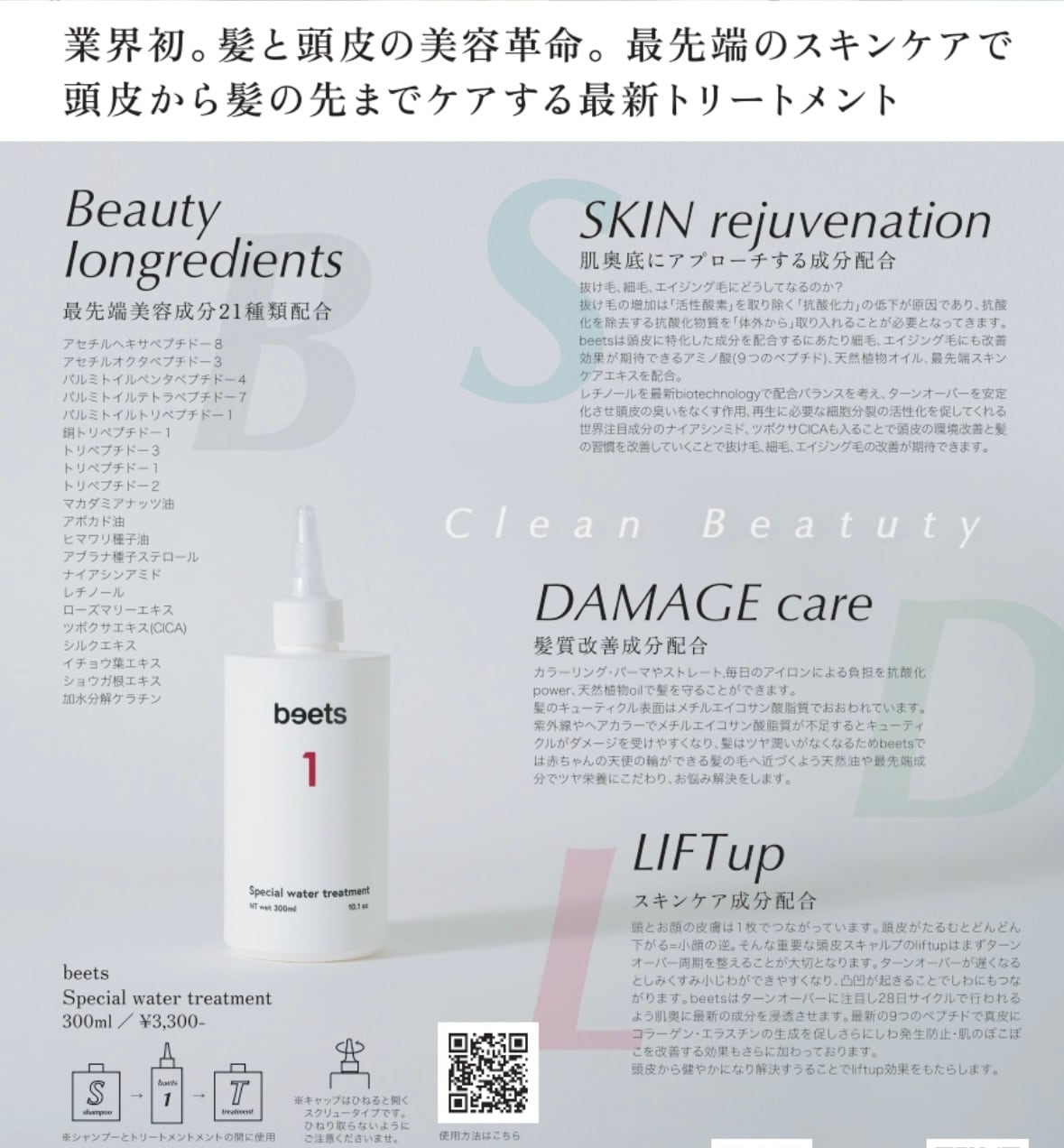 髪を保護するだけでなく、beetsは髪の内側から潤いと美しさを引き出す、全く新しいアプローチ。先端美容成分が髪の最深部(メデュラ)までしっかり届き、水分バランスを盛え、健康で健やかな髪へ導きます。